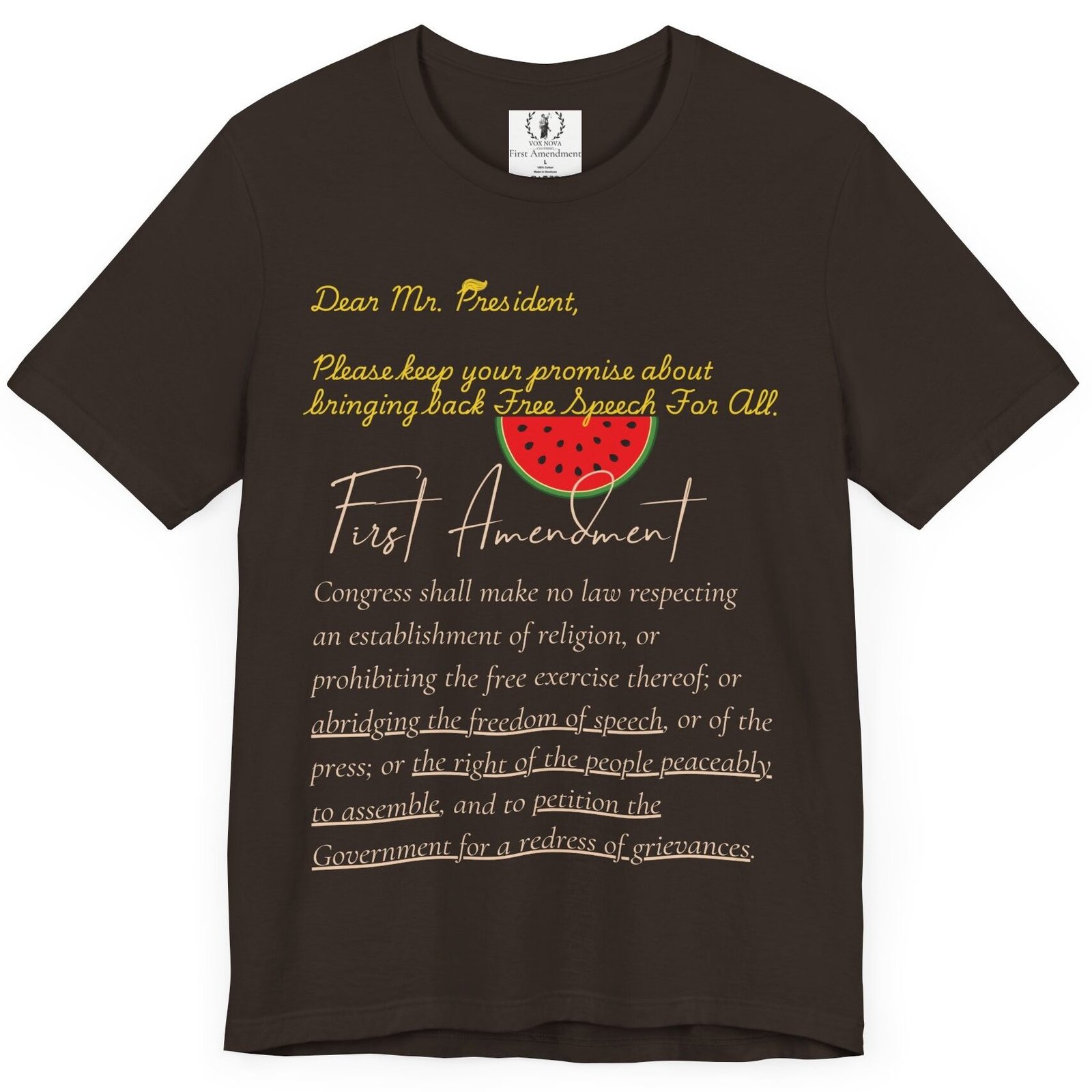 The colors of the watermelon—red, green, black, and white—mirror the Palestinian flag and serve as a quiet yet potent reminder of the struggle for justice and free expression Paired with the full text of the First Amendment, the design invites curiosity and sparks dialogue about the intersection of free speech, protest, and constitutional rights.
