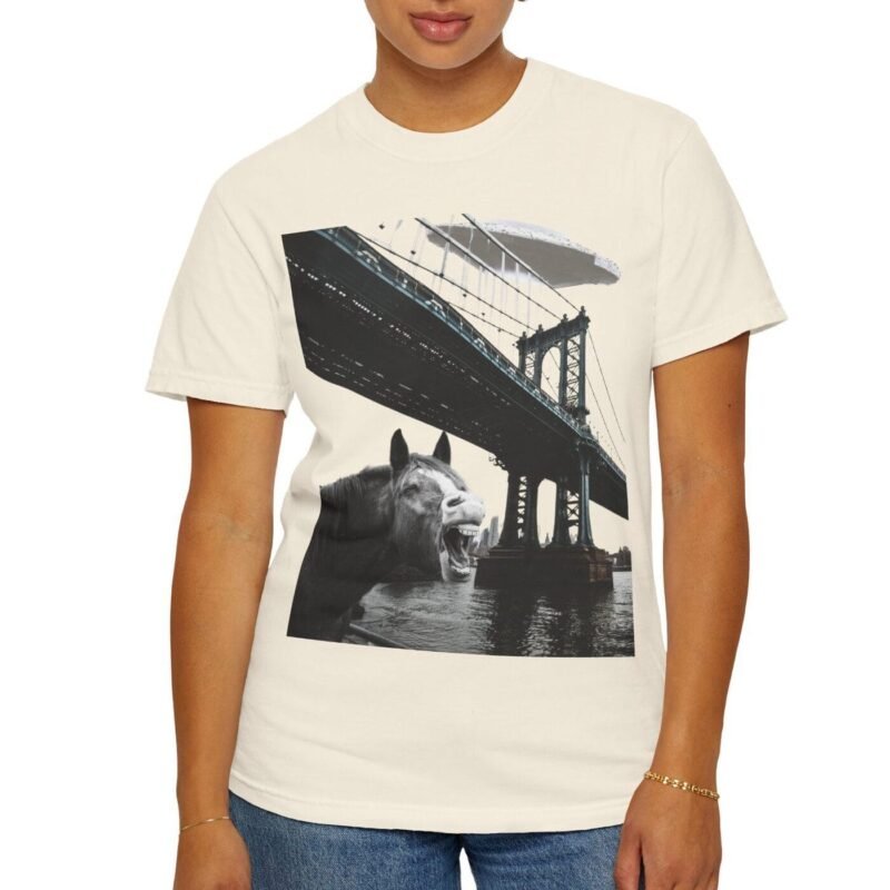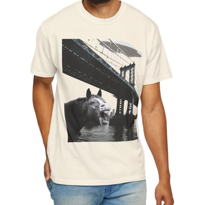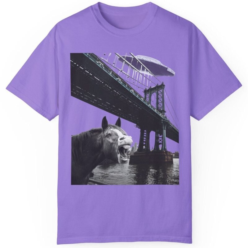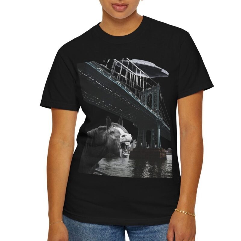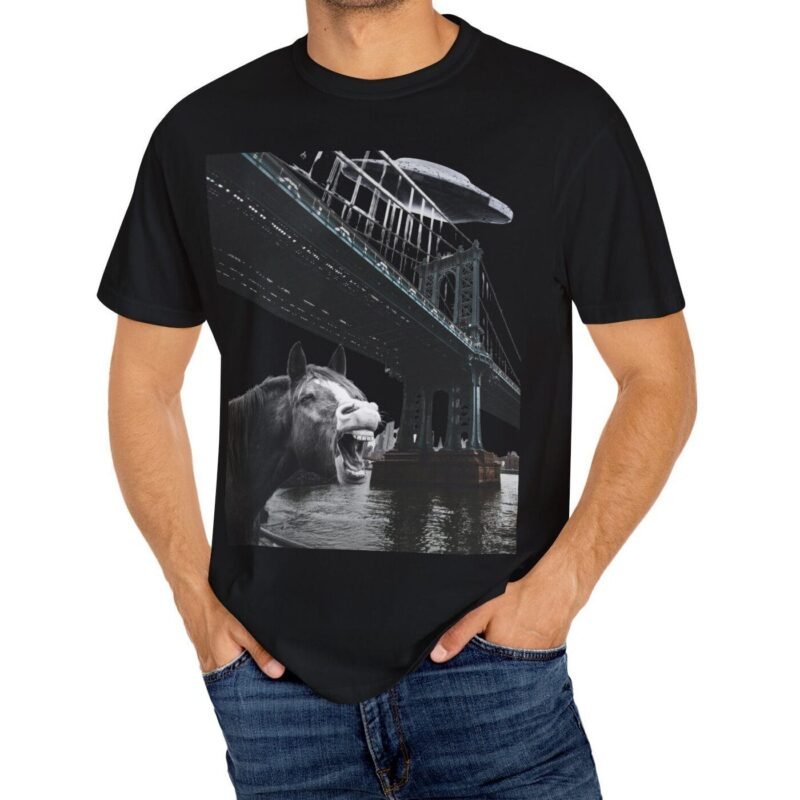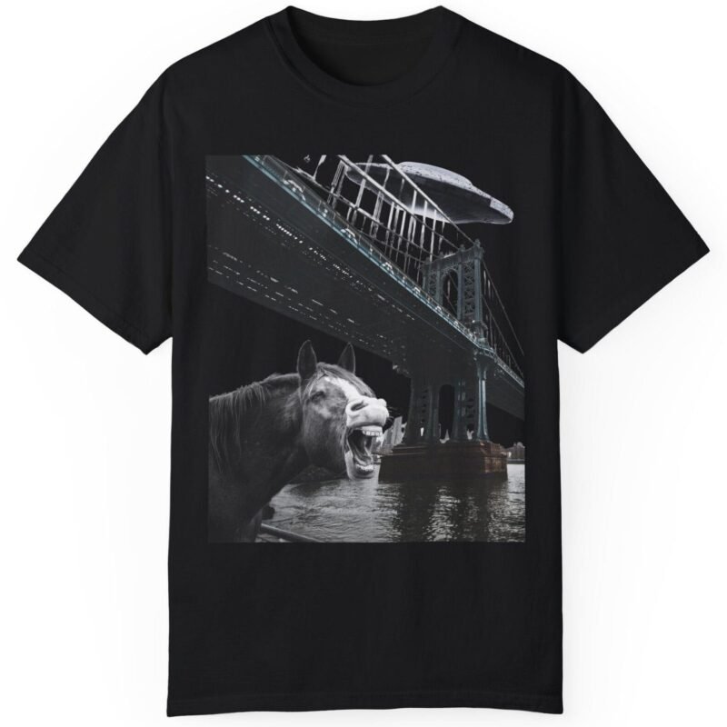 Hold your horses! What’s got this majestic steed in such a state of… bewilderment? Captured in a moment that blurs the lines between reality and conspiracy, this tee features a striking image of a horse seemingly reacting to a massive, classic saucer-shaped UFO hovering over a city bridge. Could this be another sighting linked to the infamous Project Blue Beam?