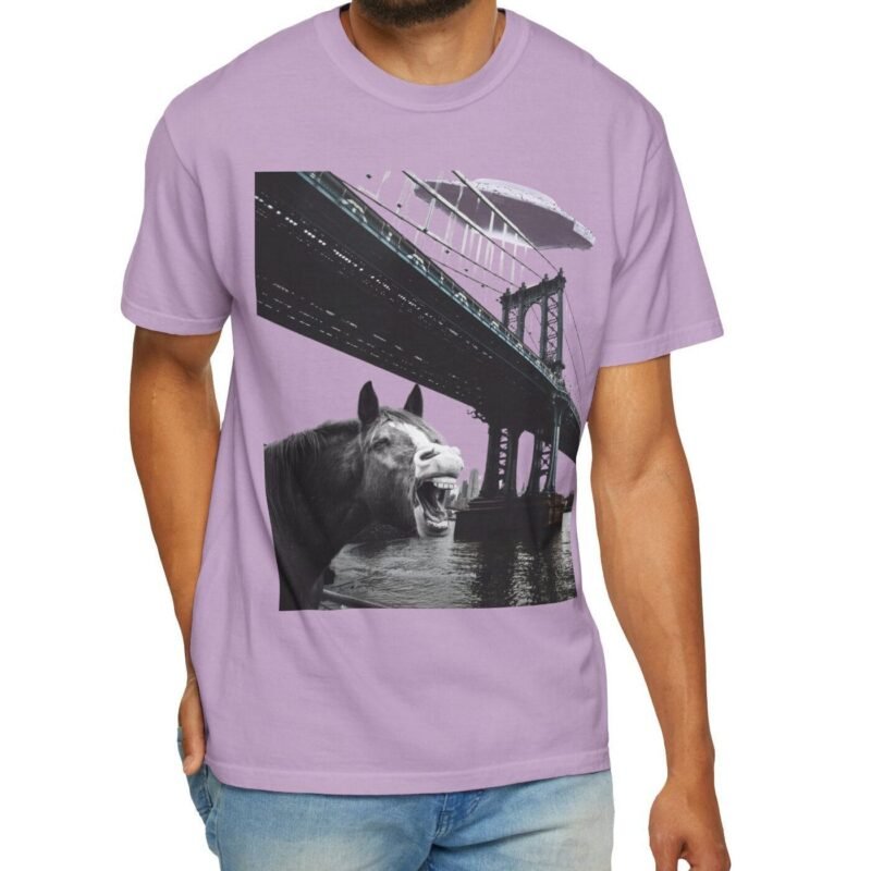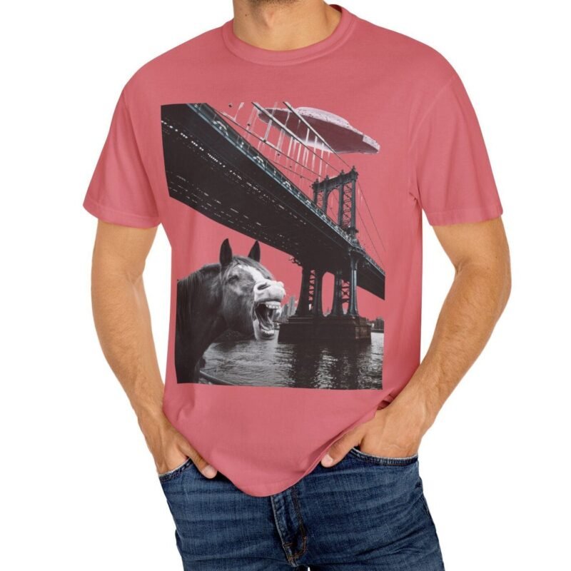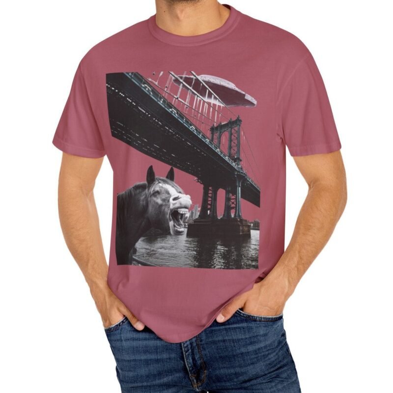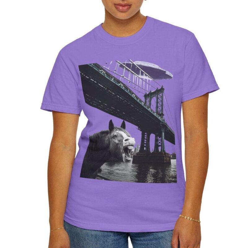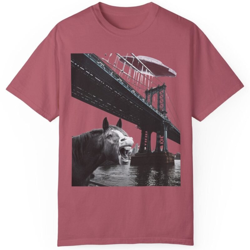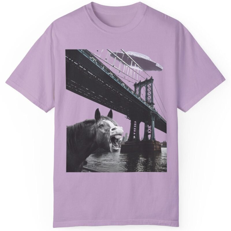 Hold your horses! What’s got this majestic steed in such a state of… bewilderment? Captured in a moment that blurs the lines between reality and conspiracy, this tee features a striking image of a horse seemingly reacting to a massive, classic saucer-shaped UFO hovering over a city bridge. Could this be another sighting linked to the infamous Project Blue Beam?
